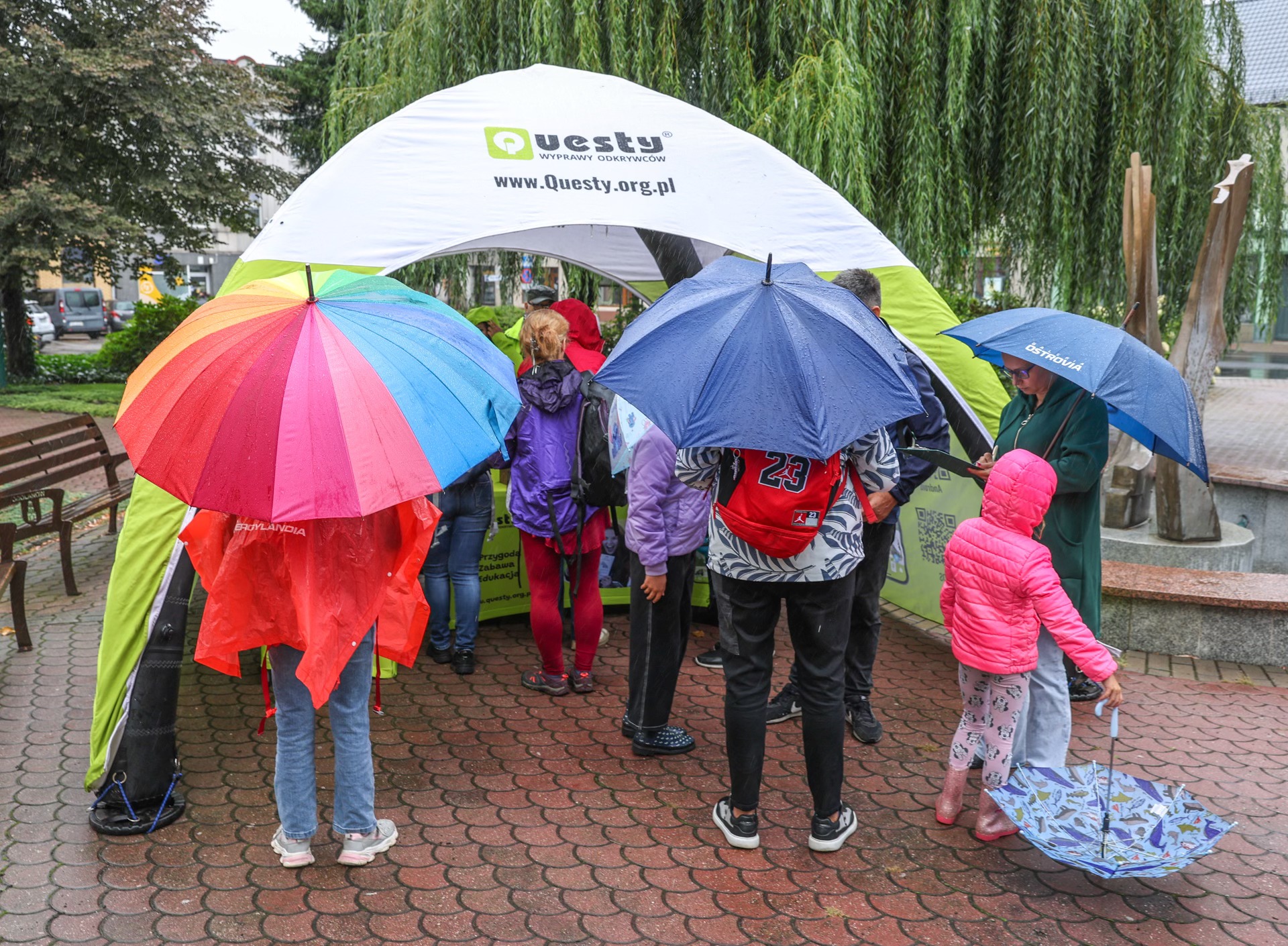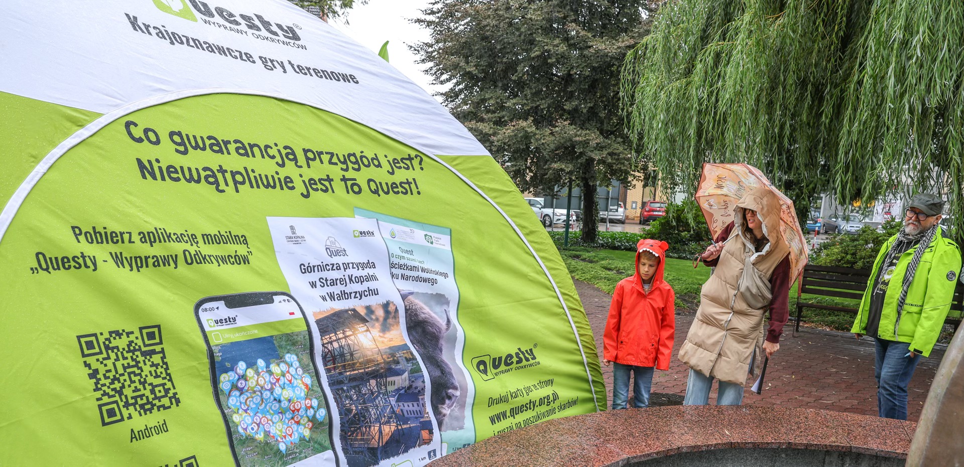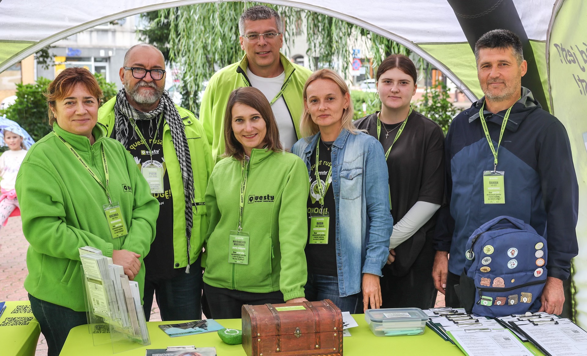 Drugim, troszkę nieplanowanym bohaterem dnia, stały się parasole. To pod nimi skrywali się nowi oraz doświadczeni odkrywcy z kartami questu spotkania, a później ulotkami gry. Tym, którzy jeszcze w grach terenowych byli zieloni, pomagali członkowie questowej ekipy oraz wolontariusze: Krzysztof, Małgosia, Basia, Marysia, Bogusia, Piotrek i Damian.