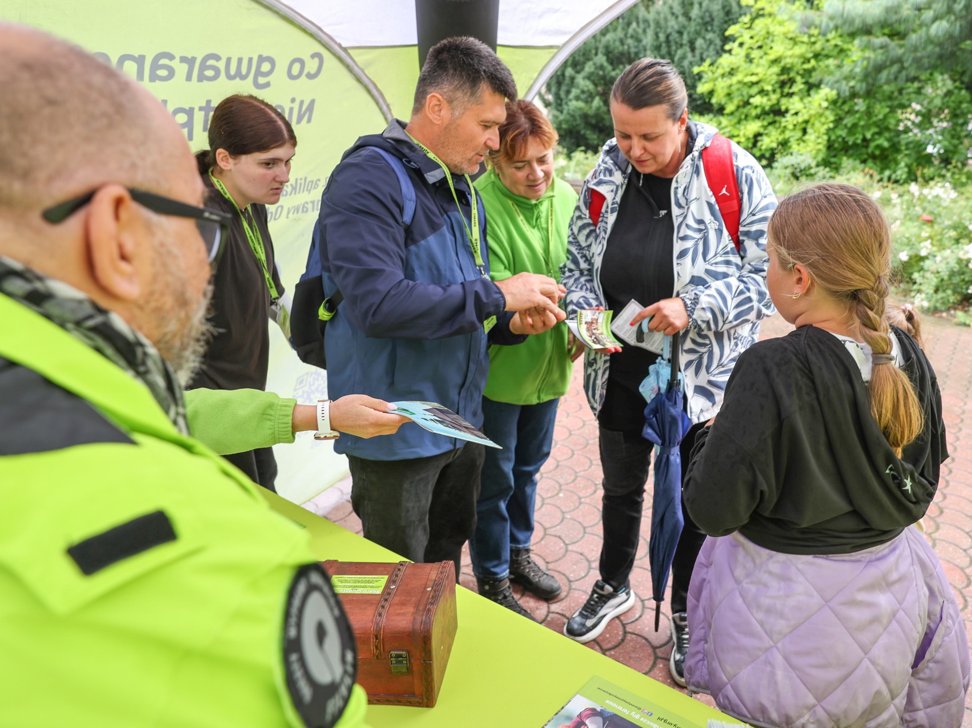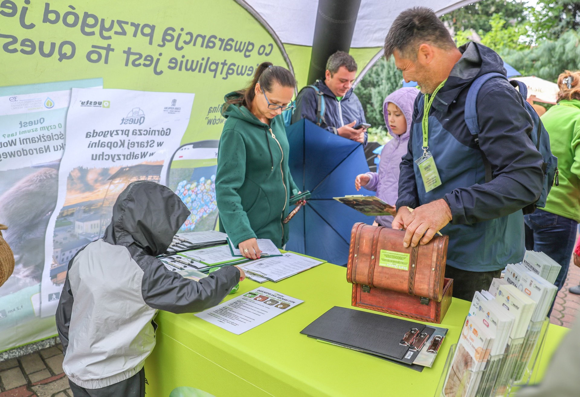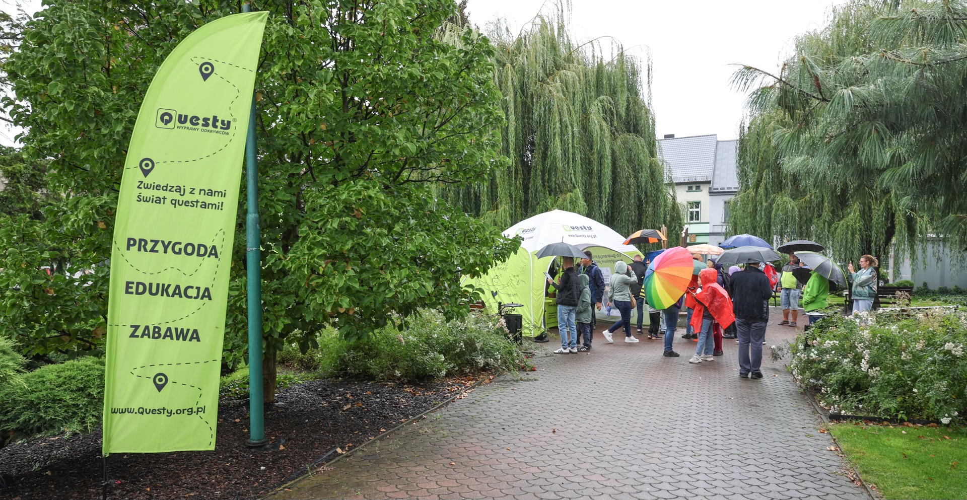 Drugim, troszkę nieplanowanym bohaterem dnia, stały się parasole. To pod nimi skrywali się nowi oraz doświadczeni odkrywcy z kartami questu spotkania, a później ulotkami gry. Tym, którzy jeszcze w grach terenowych byli zieloni, pomagali członkowie questowej ekipy oraz wolontariusze: Krzysztof, Małgosia, Basia, Marysia, Bogusia, Piotrek i Damian.
